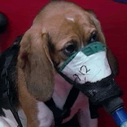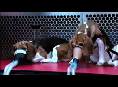 Perro beagle, raza pacífica y amistosa, sometido a una prueba de corrosión de ácidos.