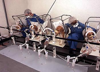 de animales torturados lenta y cruelmente hasta la muerte. Primates, ratas, gatos, perros y demas animales son sometidos a interminables baterías de pruebas forzados a beber fregasuelos, u operados sin anestesia hasta que mueren.... ¿Te imaginas que se lo hicieran a tu perro?